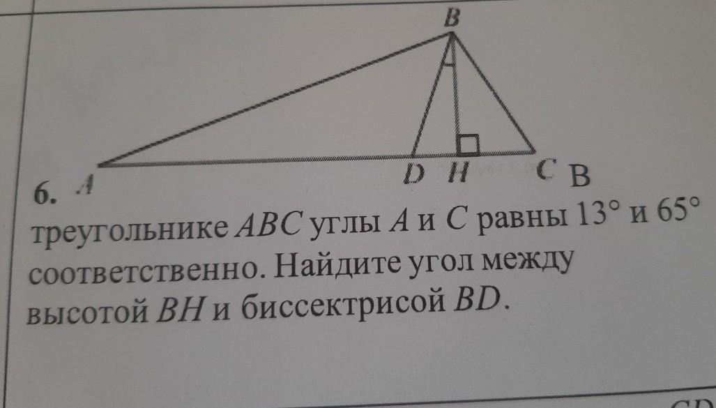 Дано: ABC - треугольник; BH - высота; BD - биссектриса; кут А= 13°; кут C= 65°;