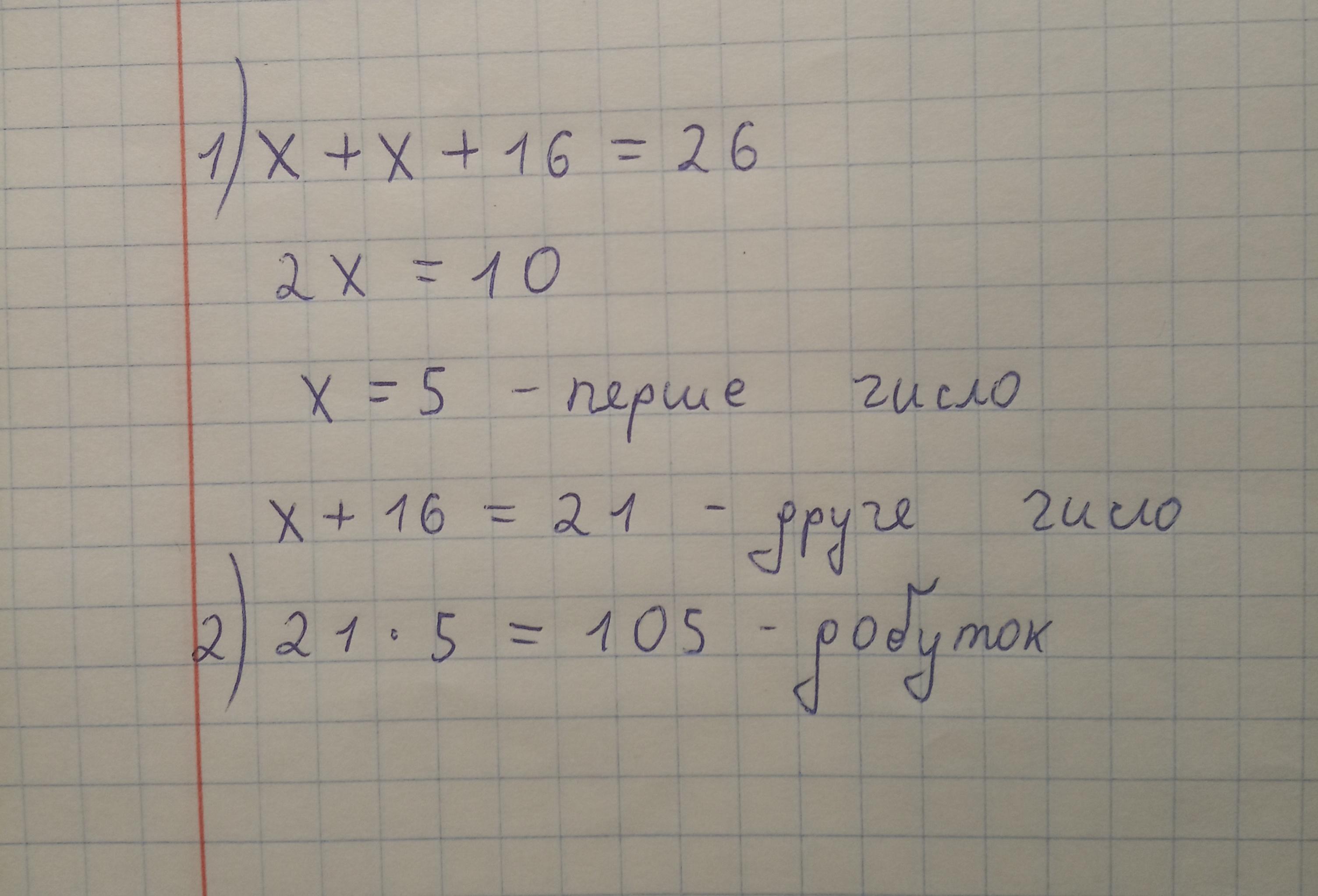 Знайдіть два числа, якщо їх сума дорівнює 26, і одне більше від іншого на 16. Вкажіть, чому дорівнює їх добуток.