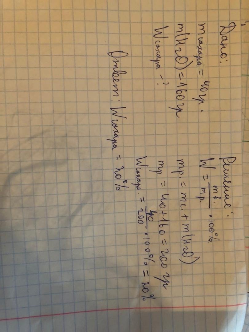 рассчитайте массовую долю сахара в сиропе, если 40 грамм сахара растворились в 160 граммах воды (с точной схемой как делать)