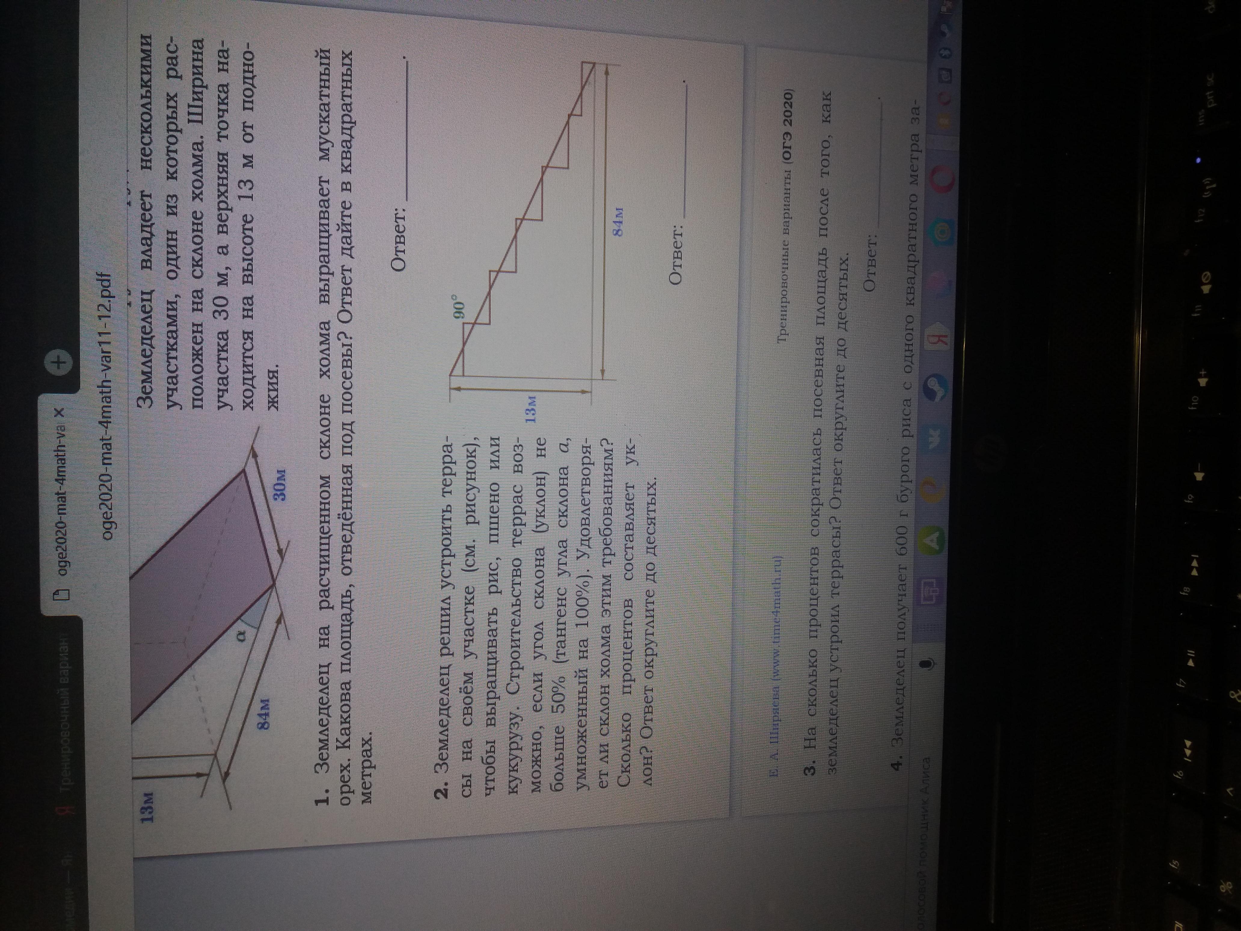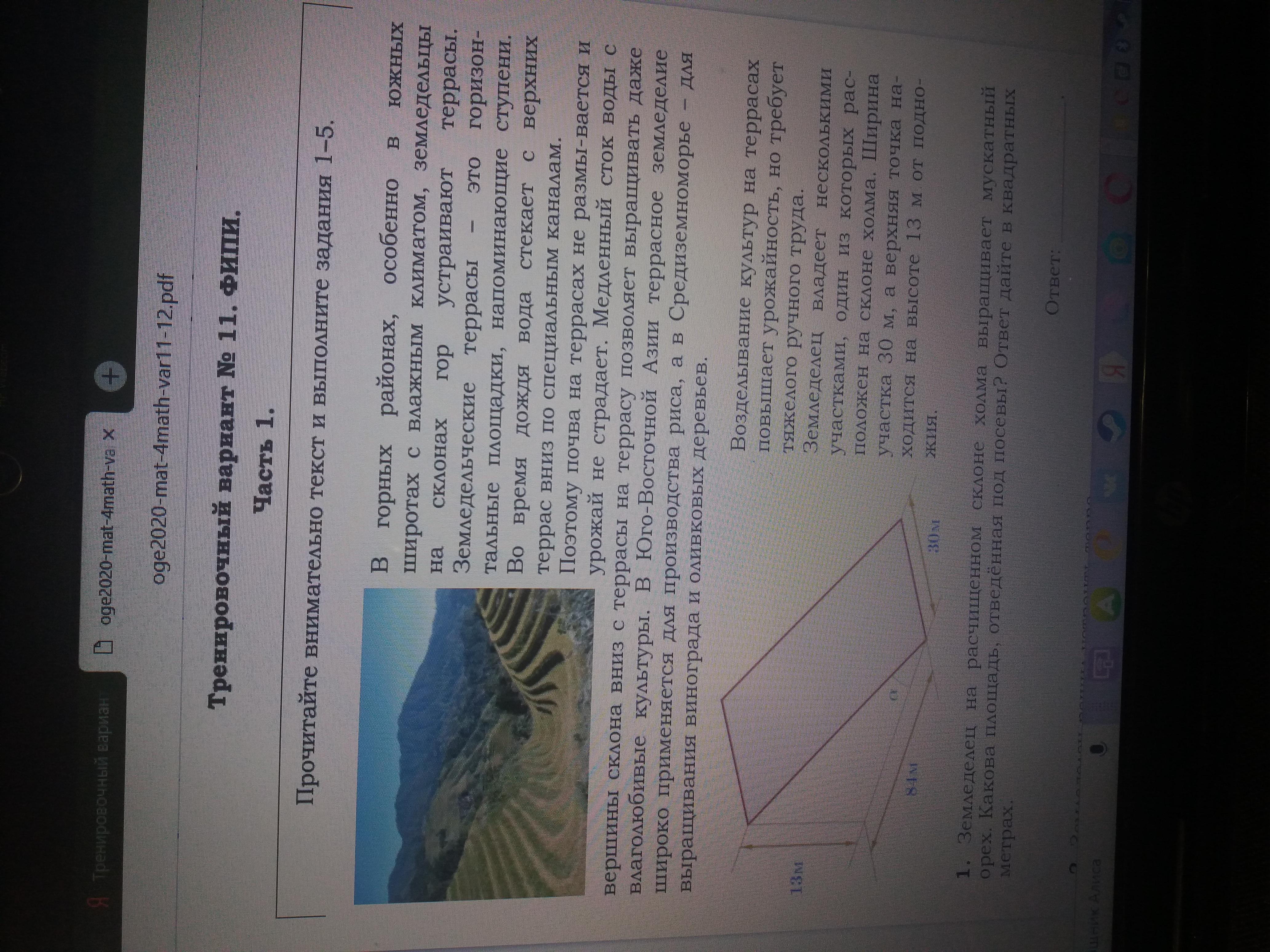 1. Терраса имеет форму прямоугольника. Его длина известна и равна 30 м. А вот ширину нужно найти. Треугольник со сторонами 84 м и 13 м, который можно увидеть на чертеже, является прямоугольным, т.к. в описании к задаче говорится, что высота равна 13 м ( ...верхняя точка находится на высоте 13 м от подножия). По теореме Пифагора находим третью сторону этого треугольника. Она и будет шириной прямоугольника.