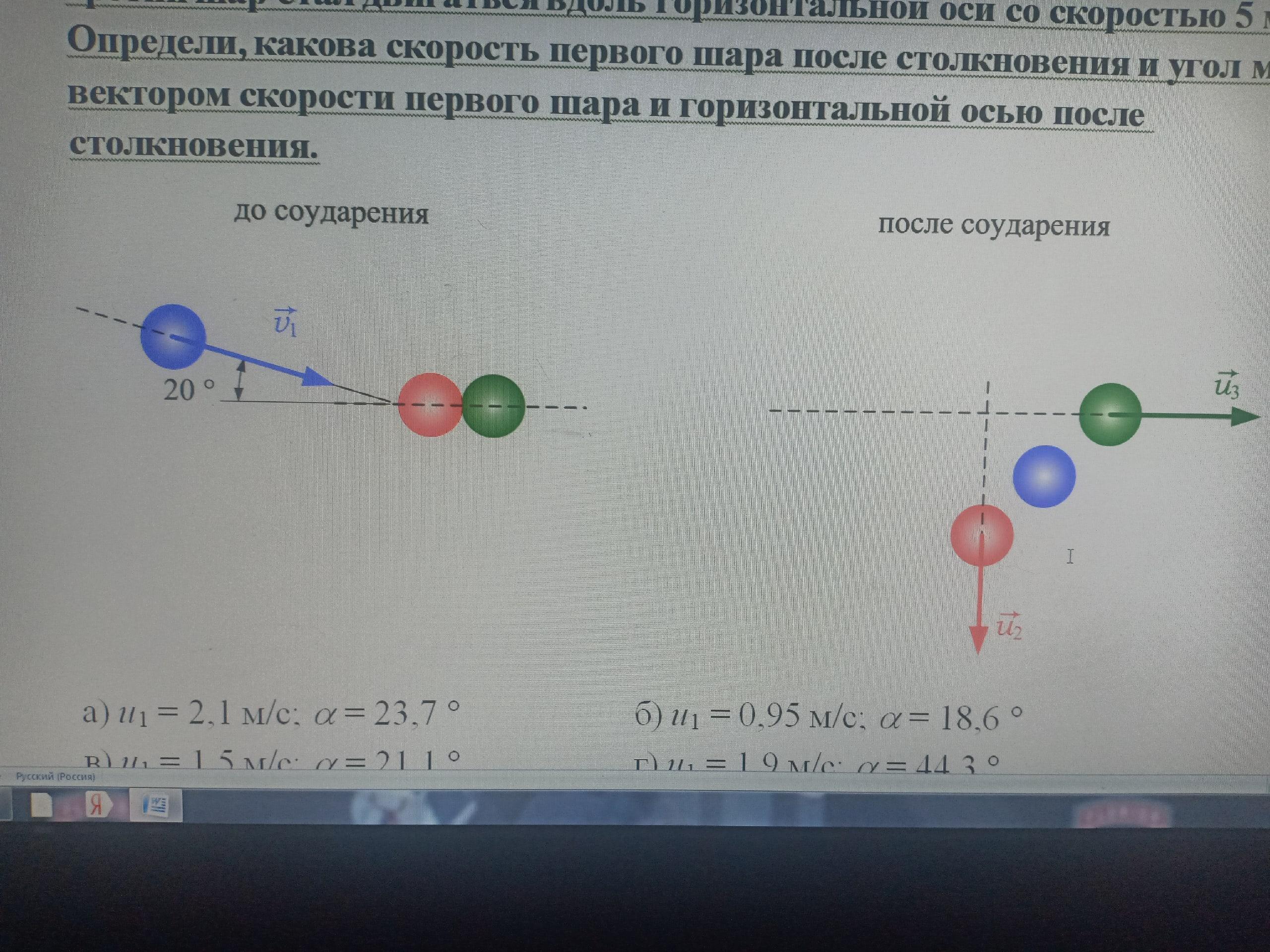 20 баллов! Хелп! Первый шар массой 2,5 кг движется со скоростью 10 м/с. Он попадает в два покоящихся шара, которые плотно прилегают друг к другу. Масса второго шара 2 кг, а масса третьего шара 4 кг. После столкновения второй шар стал двигаться вдоль вертикальной оси со скоростью 3,6 м/с, а третий шар стал двигаться вдоль горизонтальной оси со скоростью 5 м/с. Определи, какова скорость первого шара после столкновения и угол между вектором скорости первого шара и горизонтальной осью после столкновения. Нужно с решением!