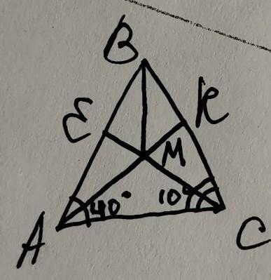 Биссектрисы углов А и С треугольника АВС пересекаются в точке М. Найдите ∠СМВ,если∠МАС=40°,∠МСА=10°