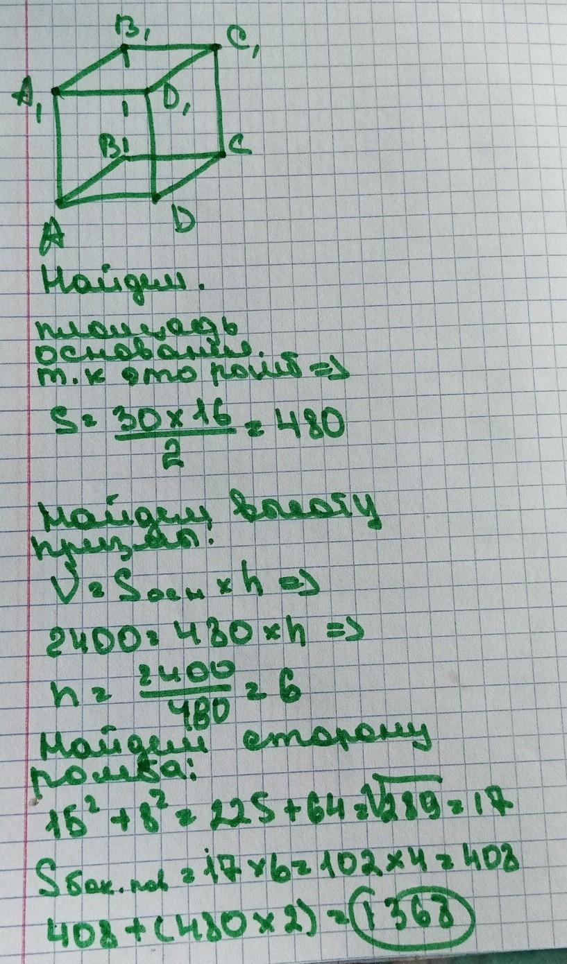 Объём прямой призмы ABCD A1 B1 C1 D1 равен 2400см^3,ромб ABCD с диагоналями AC=30см BD=16см. Найти площадь боковой поверхности призмы.