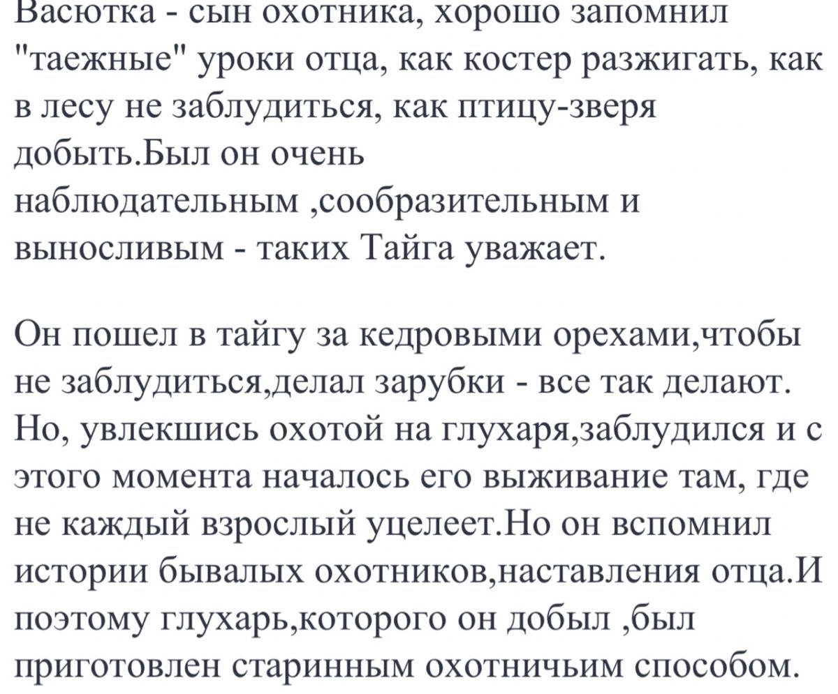 Он знал,как и где надо прятаться чтобы самому не стать добычей дикого зверя,ведал,что съедобно,а что надо мимо рта пропускать.Но главное,он знал,куда нужно идти,а тоисть к реке которая выведет к людям.В жизне очень важны таки качества как выносливость,сообразительность,находчивость эти качества как раз таки помогли Васютке выжить в тайге