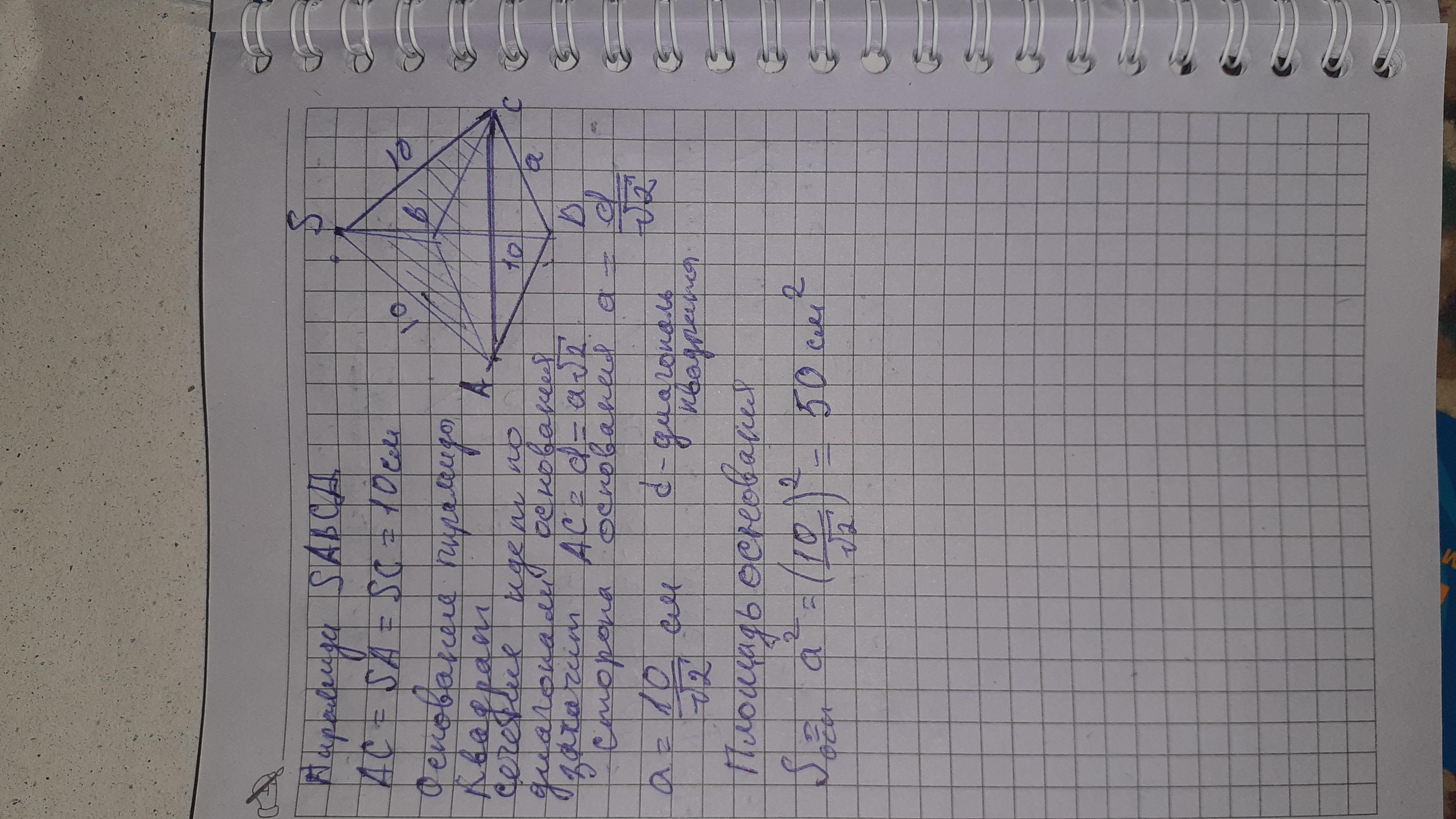 Диагональный сечение правильной четырехугольной пирамиды является равносторонним треугольником со стороной 10 см. Найдите площадь основания этой пирамиды.