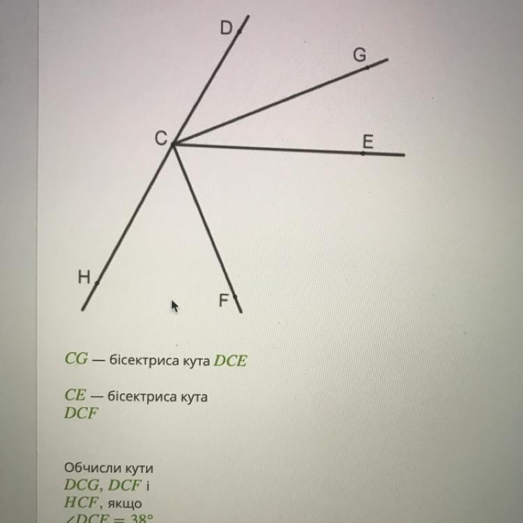 G-бісектриса кута DCE, CE- бісектриса кутаDCF, Обчисли кути DCG,DCF і HCF, якщо кут DCE =38градусив