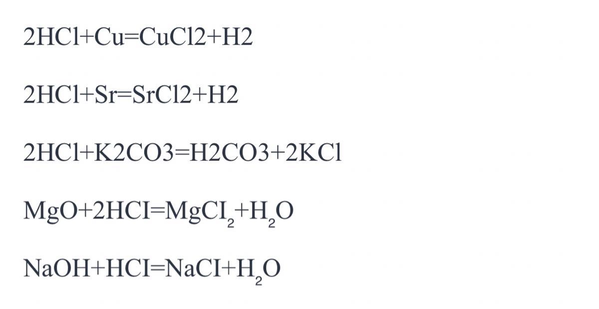 Приведён ряд веществ: Cu, Sr, NaOH, ZnO, K2CO3, H2SO4, CO2. Укажи количество возможных реакций с участием соляной кислоты.