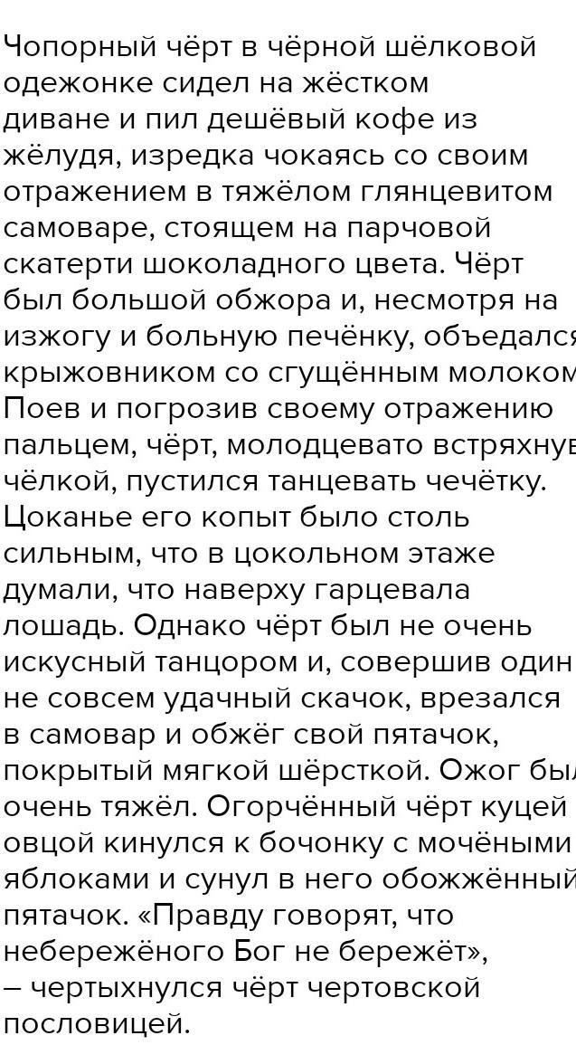 Поев и погрозив своему отражению пальц..м, ч..рт, молодц..вато встряхнув ч..лкой, пустился танцевать чеч..тку. Ц..канье его копыт было столь сильным, что в ц..кольном этаже думали, что наверху гарц..вала лошадь. Однако ч..рт был не очень искусным танц..ром и, совершив один не совсем удачный скач..к, врезался в самовар и обж..г свой пятач..к, покрытый мягкой ш..рсткой. Огорч..нный ч..рт куц..й овц..й кинулся к боч..нку с моч..ными яблоками и сунул в него обожж..нный пятач..к. "Правду говорят, что небереж..ного Бог не береж..т", - ч..ртыхнулся ч..рт ч..ртовской пословиц..й.