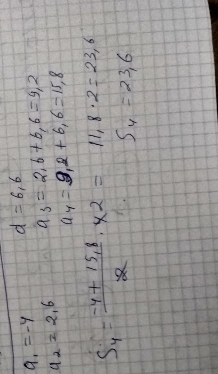 Вычисли следующие два члена арифметической прогрессии и сумму первых четырёх членов, если a1=−4 и a2=2,6.