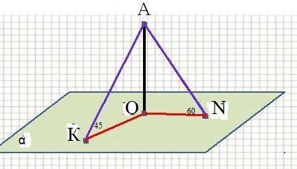 С точки А до плоскости альфа проведены две наклонные АК и АN. которые образуют с плоскостью альфа углы 45° и 60° соответственно. Найдите длины наклонных, если расстояние от точки А до плоскости альфа равно