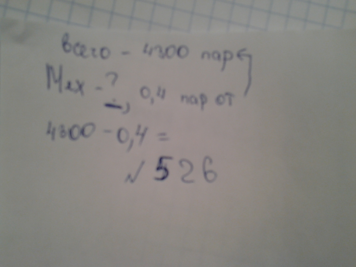 чтобы найти сколько пар обуви было на натуральном меху, нужно найти дробь от числа, т.е.:4300*0,4=1720. Ответ: 1720 пар обуви на натур. меху изготовлено.