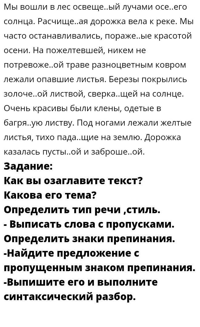 Мы вошли в лес(,) освещёННый лучами осеННего солнца. РасчищеННая дорожка вела к реке. Мы часто останавливались, поражёННые красотой осени. На пожелтевшей, никем не потревожеННой траве разноцветным ковром лежали опавшие листья. Березы покрылись золочеНой листвой, сверкаЮщей на солнце. Очень красивы были клёны, одетые в багряНую листву.