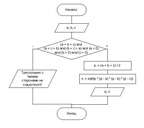 Даны длины сторон треугольника. Составьте блок- схему для вычисления полупериметра треугольника и его площадь.Пожалуйста помогите!!!