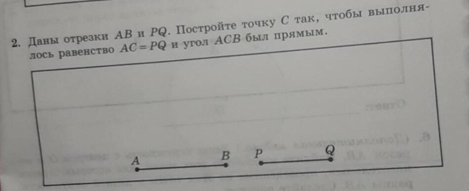 Даны отрезки AB и PQ. Постройте точку C так, чтобы выполнялось равенство AC=PQ и угол ACB был прямым.