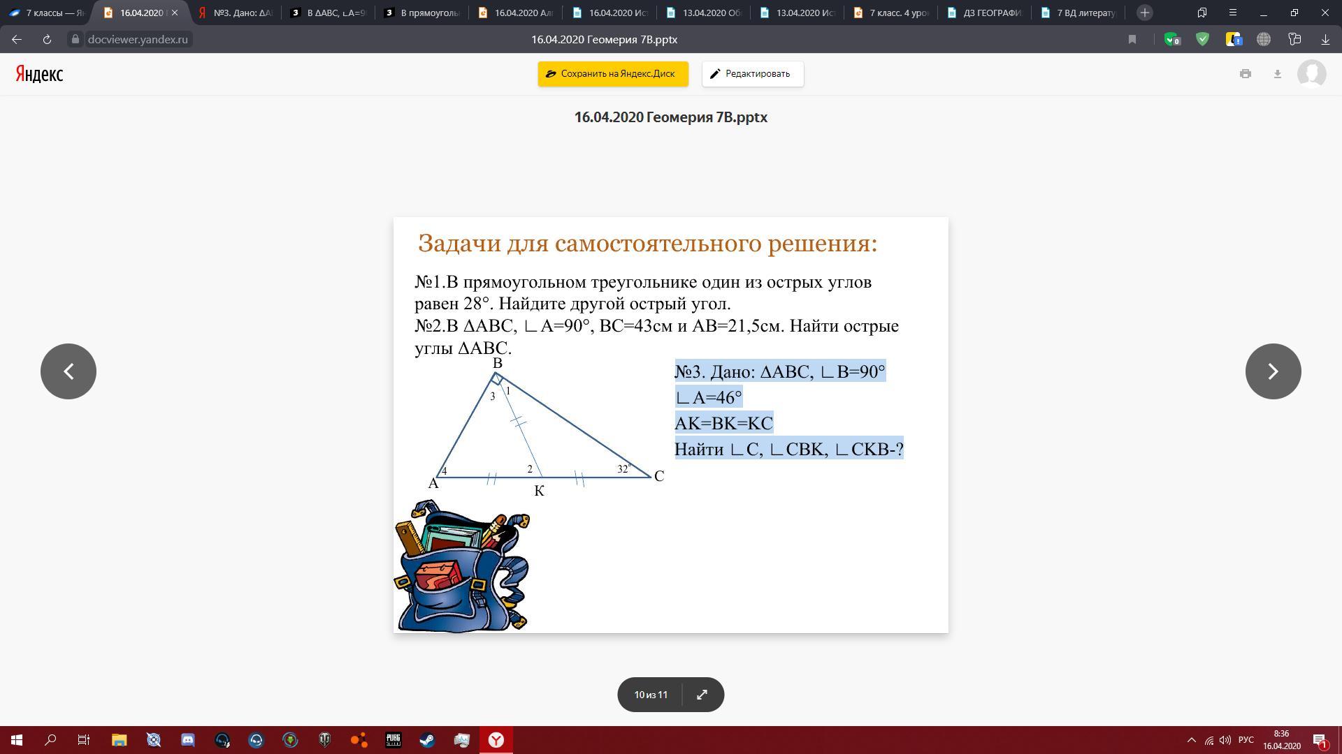 Дано: ∆АВС, ∟B=90° ∟A=46° AK=BK=KC Найти ∟C, ∟CВK, ∟CKB-?