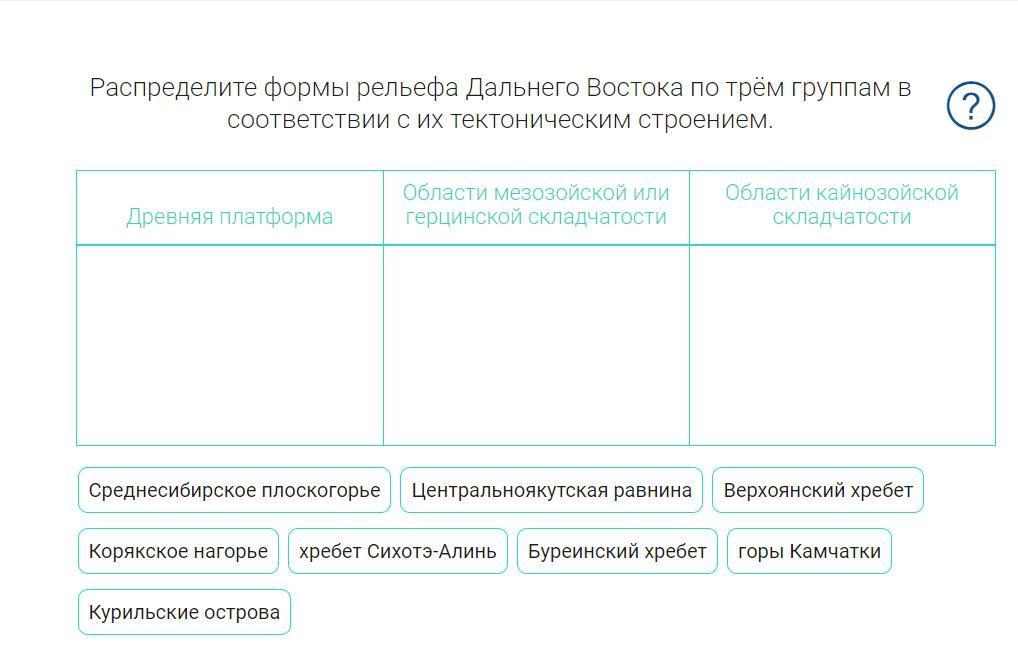 Распределите формы рельефа Дальнего Востока по трём группам в соответствии с их тектоническим строением.