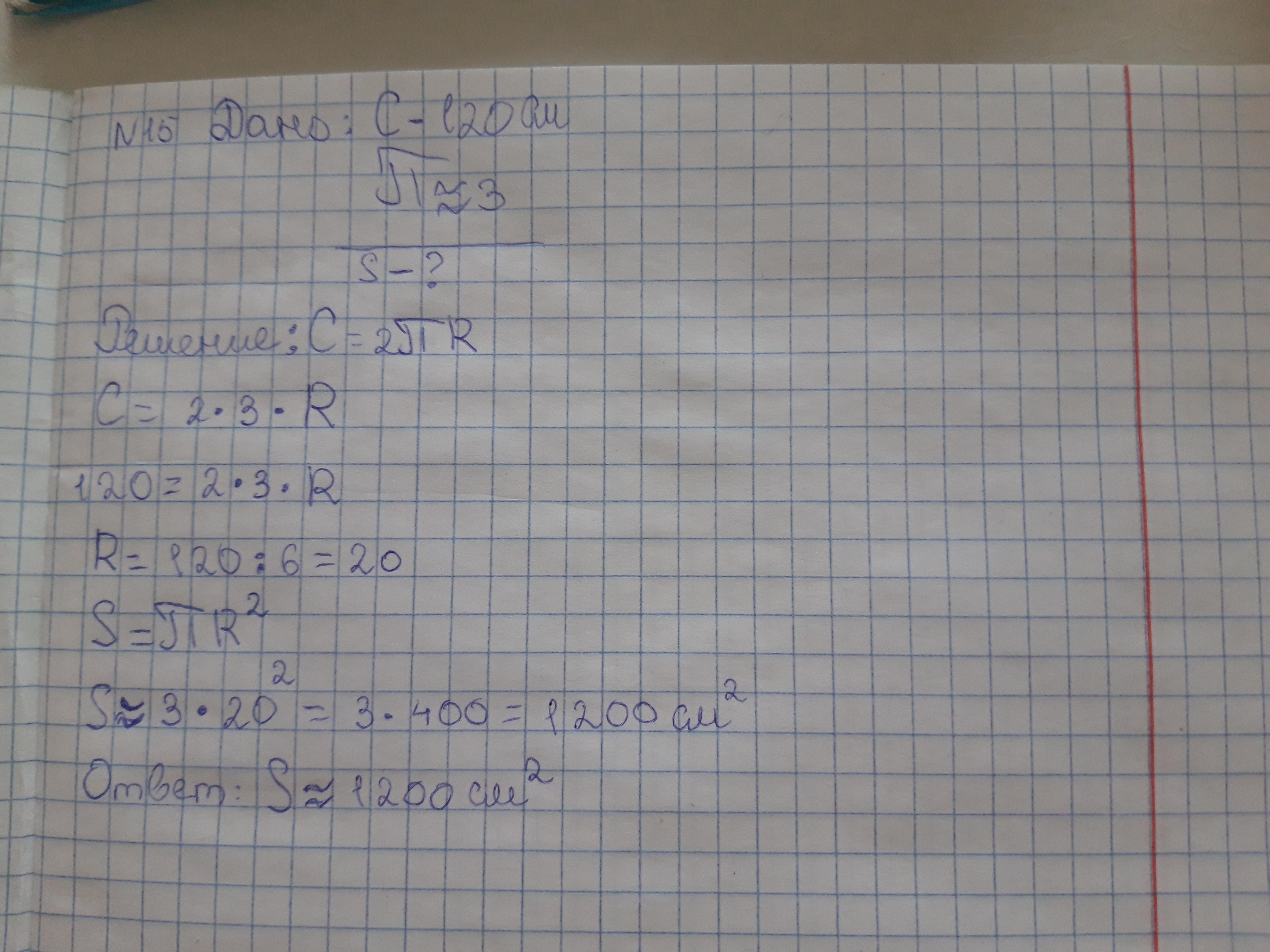 дерево имеет в обхвате 120 см. найдите примерную площадь поперечного сечения (в см^2), имеющего форму круга( примените пи≈3). Если можно по подробнее. заранее спасибо