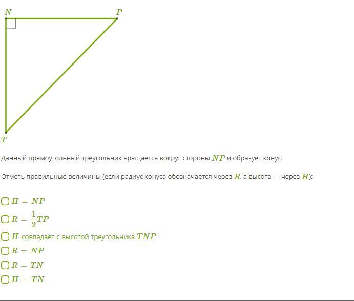 Помогите пожалуйста! Отметь правильные величины (если радиус конуса обозначается через R, а высота — через H):