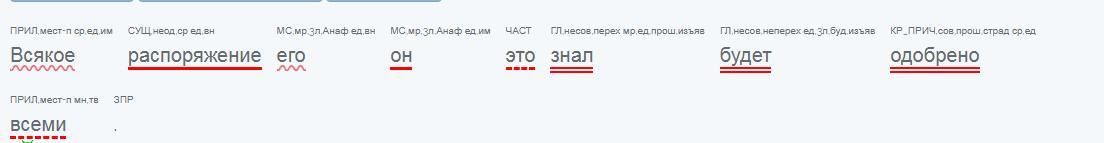 выполнить синтаксический разбор предложения: Всякое распоряжение его он это знал будет одобрено всеми.