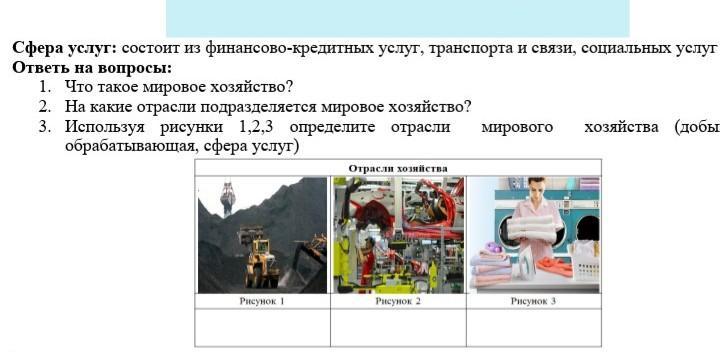 3. Используя рисунки 1,2,3 определите отрасли мирового хозяйства (добывающая, обрабатывающая, сфера услуг)