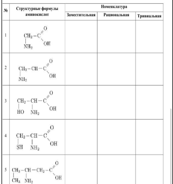 Запишите структурные формулы и названия по заместительниц, рациональной и тривиальной номенклатуре первых пяти членов аминокислот