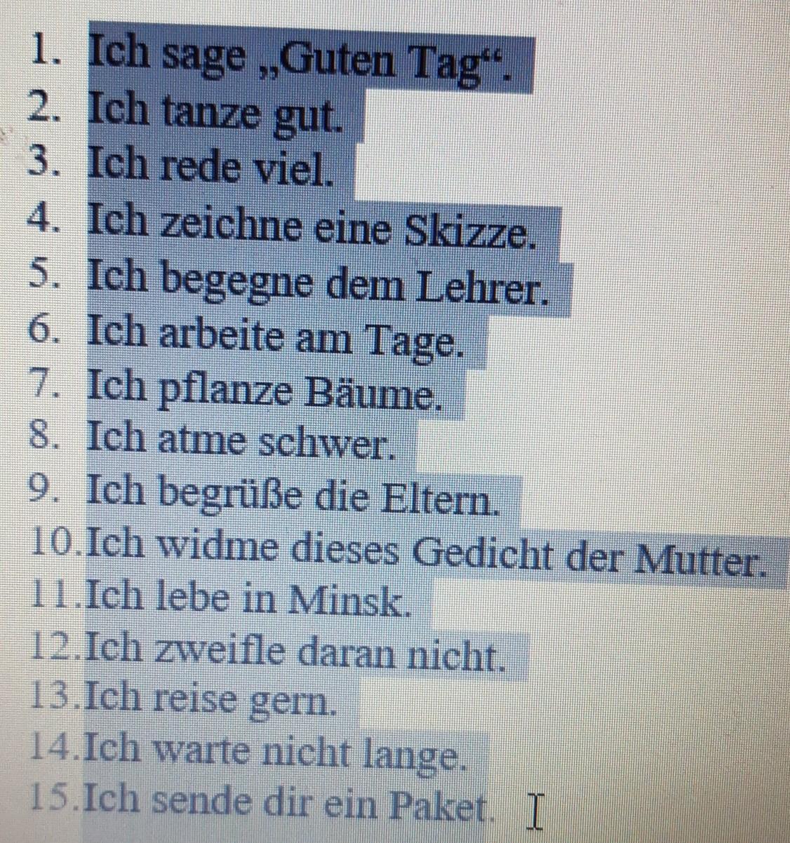 Er/Sie/Es sagt .. . / Er/Sie/Es tanzt ... / Er/Sie/Es redet ... / Er/Sie/Es zeichnet ... / Er/Sie/Es begegnet ... / Er/Sie/Es arbeitet... . / Er/Sie/Es pflanzt ... / Er/Sie/Es atmet ... ./ Er/Sie/Es begrüßt ... ./ Er/Sie/Es widmet ... ./ Er/Sie/Es lebt ... / Er/Sie/Es zweifelt ... / Er/Sie/Es reist ... / Er/Sie/Es wartet ... / Er/Sie/Es sendet ... .