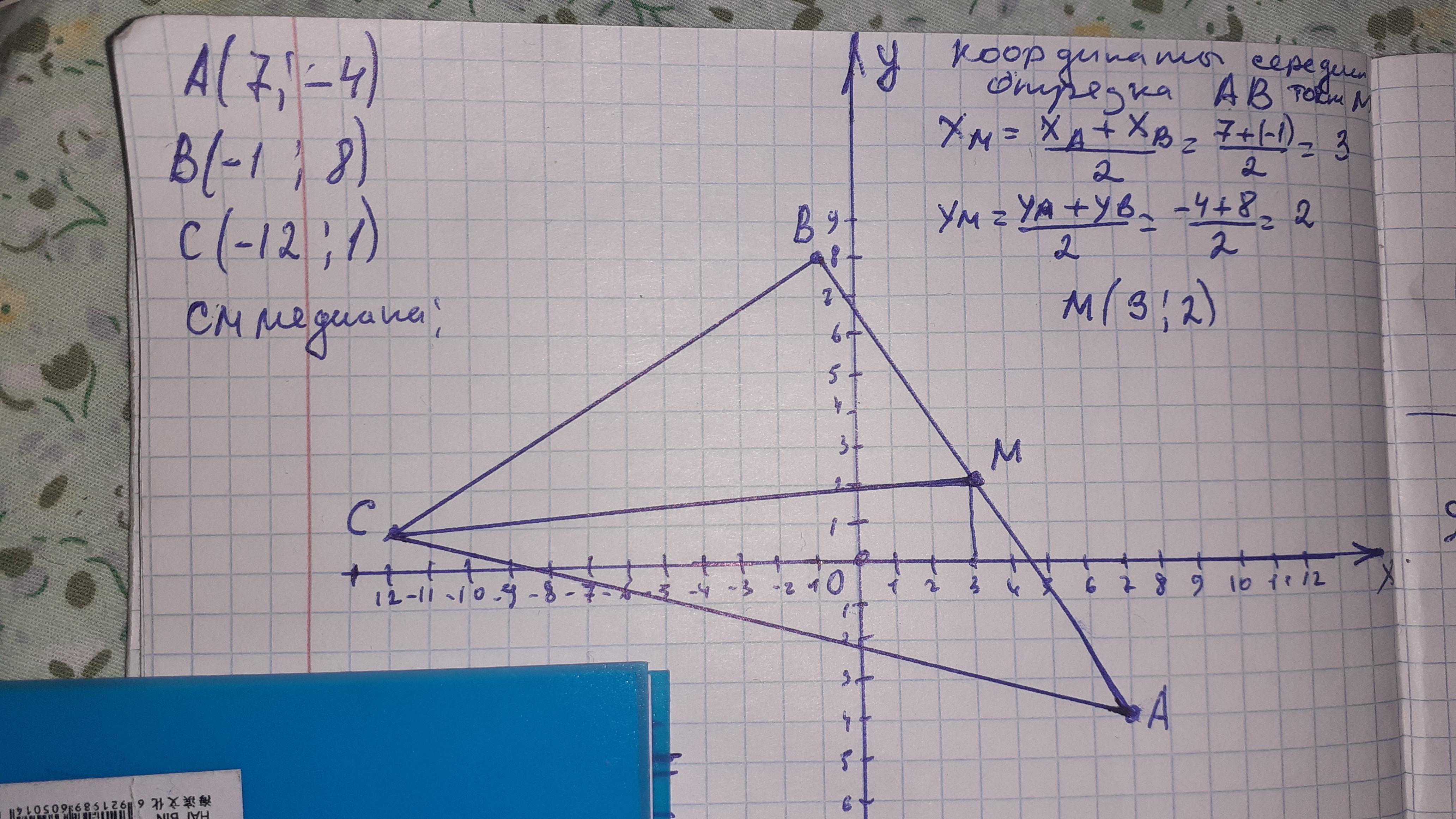 A(7;-4), B(-1;8), C(-12;-1) треугольника CM медиана (просто задача была на казахском) как решить?