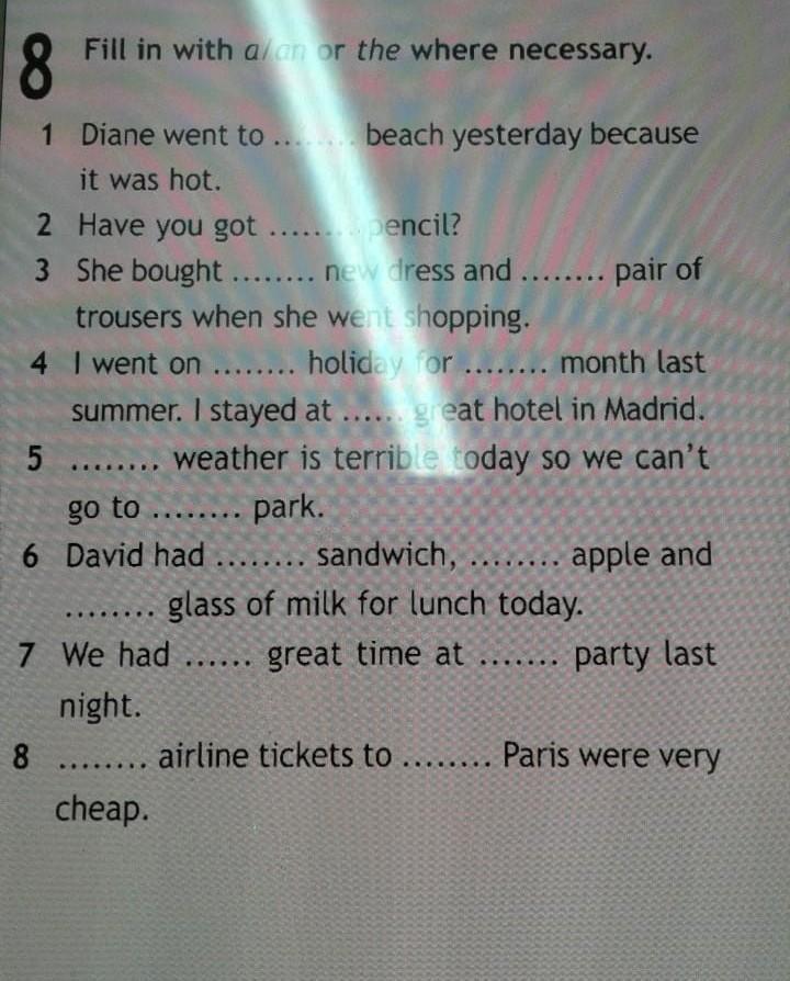 Ответ:8. Fill in with alan or the where necessary. 1 Diane went to the beach yesterday because it was hot. 2 Have you got a pencil? 3 She bought. trousers when she went shopping. new dress and..... pair of shoes. 4 I went on the holiday for month last summer. I stayed at the great hotel in Madrid. weather is terrible today so we can't go to 6 David had park. He had sandwich, apple and glass of milk for lunch today. 7 We had great time at the party last nigh . 8 The airline tickets to Paris were very cheap.