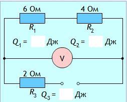 Какое количество теплоты выделится за 2 с на каждом из сопротивлений R1, R2, R3, если вольтметр показывает напряжение 5 В?