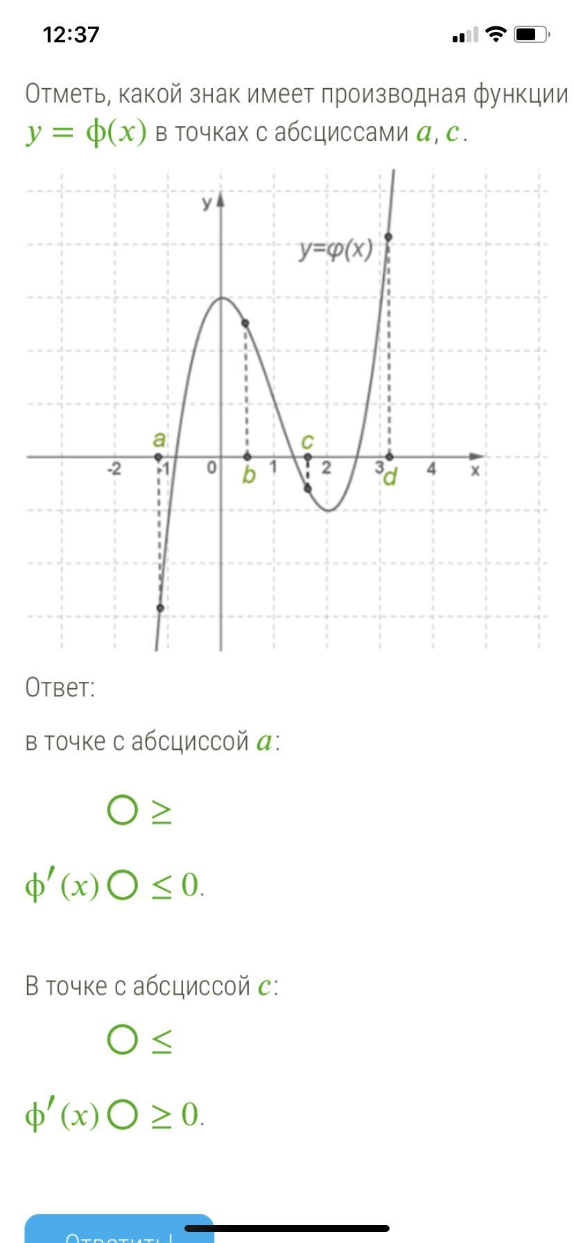 Отметь, какой знак имеет производная функции y=Ф(x) в точках с абсциссами a,c