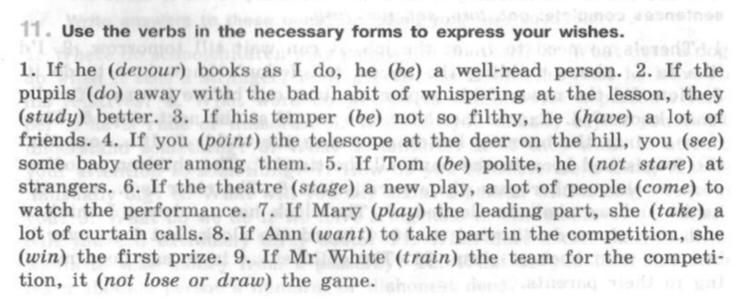 1. Если он (пожирает) книги, Как я, то он (будет) начитанным человеком. 2. Если ученики (делают) прочь дурную привычку шептаться на уроке, они (учиться хорошо. 8. Если бы его характер не был таким мерзким, то он бы много чего сделал. друзья. 4. Если вы (направите) телескоп на оленя на холме, вы (смотрите) среди них были и детеныши оленей. 5. Если том (быть) вежливым, он (не пялиться) на незнакомцы. 6. Если в Театре (на сцене) новая пьеса, то очень много людей (приходят) на нее. смотрите представление. 7. Если Мэри (играет) главную роль, она (берет) на себя много звонков на занавес. 8. Если Энн (хочет) принять участие в конкурсе, то она (выиграть) первый приз. 9. Если мистер Уайт (тренирует) команду для соревнований- Тион, это (не проигрыш и не ничья) игра.