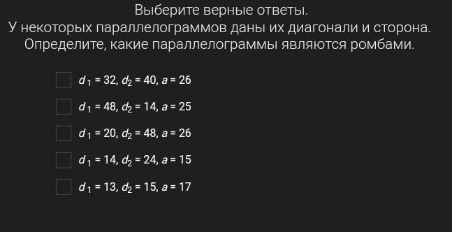 диагонали в ромбе пересекаются под прямым углом. находим ответ, в котором квадрат стороны равен сумме квадратов половин диагоналей