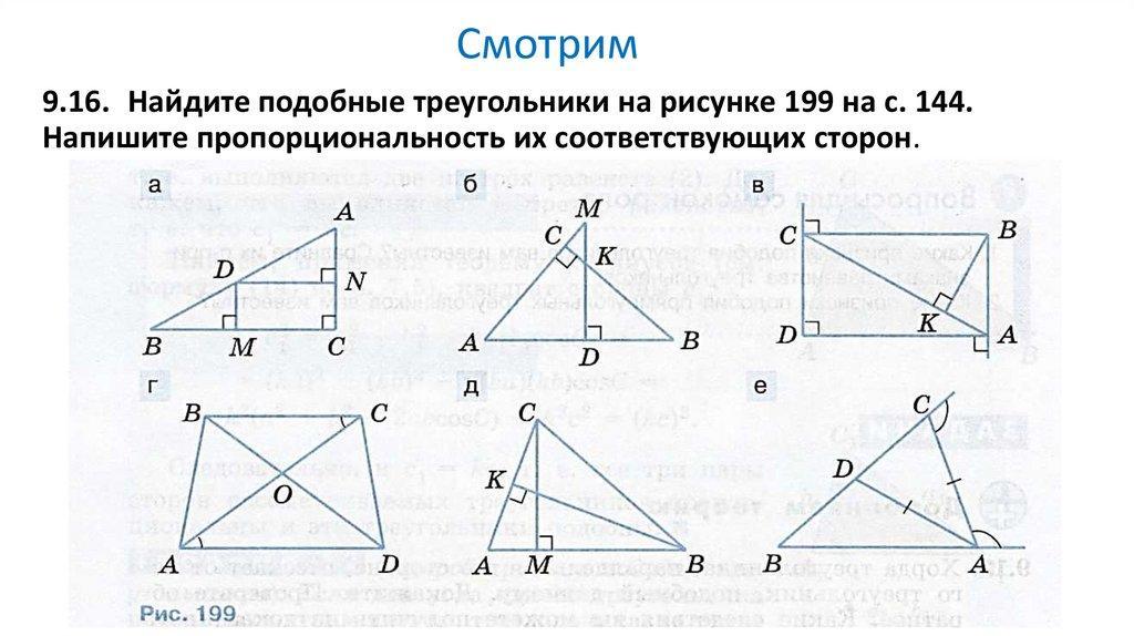 найдите подобные треугольники на рисунке 199. Напишите пропорциональность их соответствующих сторон.