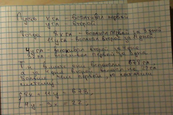 1 тракторист вспахал всего - х га2 тракторист - 678-х1 тракторист вспахивал за 1 день - х/82 тракторист - (678-х)/113*х/8+22=(678-х)/113х/8+22=(2712-4х)/11(3х+176)/8=(2712-4х)/1133х+1936=21696-32х65х=19760х=304 (га) - вспахал всего 1 тракторист678-304=374 (га) - вспахал всего 2 тракторист304/8=38 (га) - вспахал 1 тракторист за 1 день374/11=34 (га) - вспахал 2 тракторист за 1 день