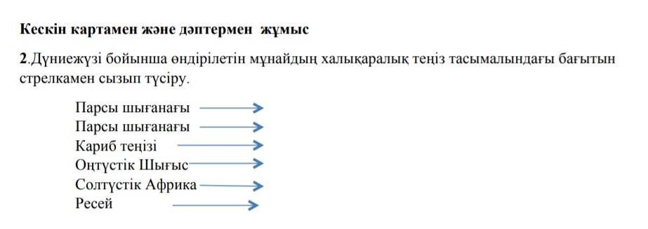 Дүниежүзі бойынша өндірілетін мұнайдың халықаралық теңіз тасымалындағы бағытын стрелкамен сызып түсіру.