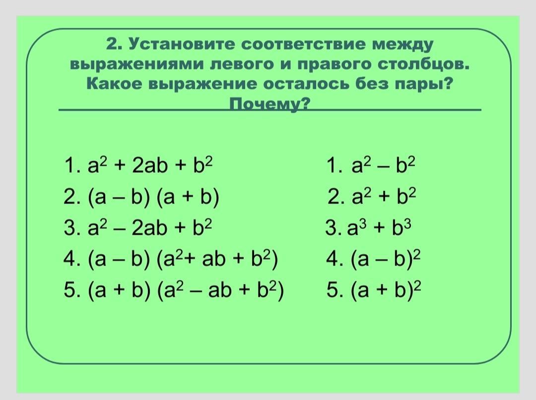 установите соответствие между выражениями левого и правого столбцов. Какое выражение осталось без пары. Почему