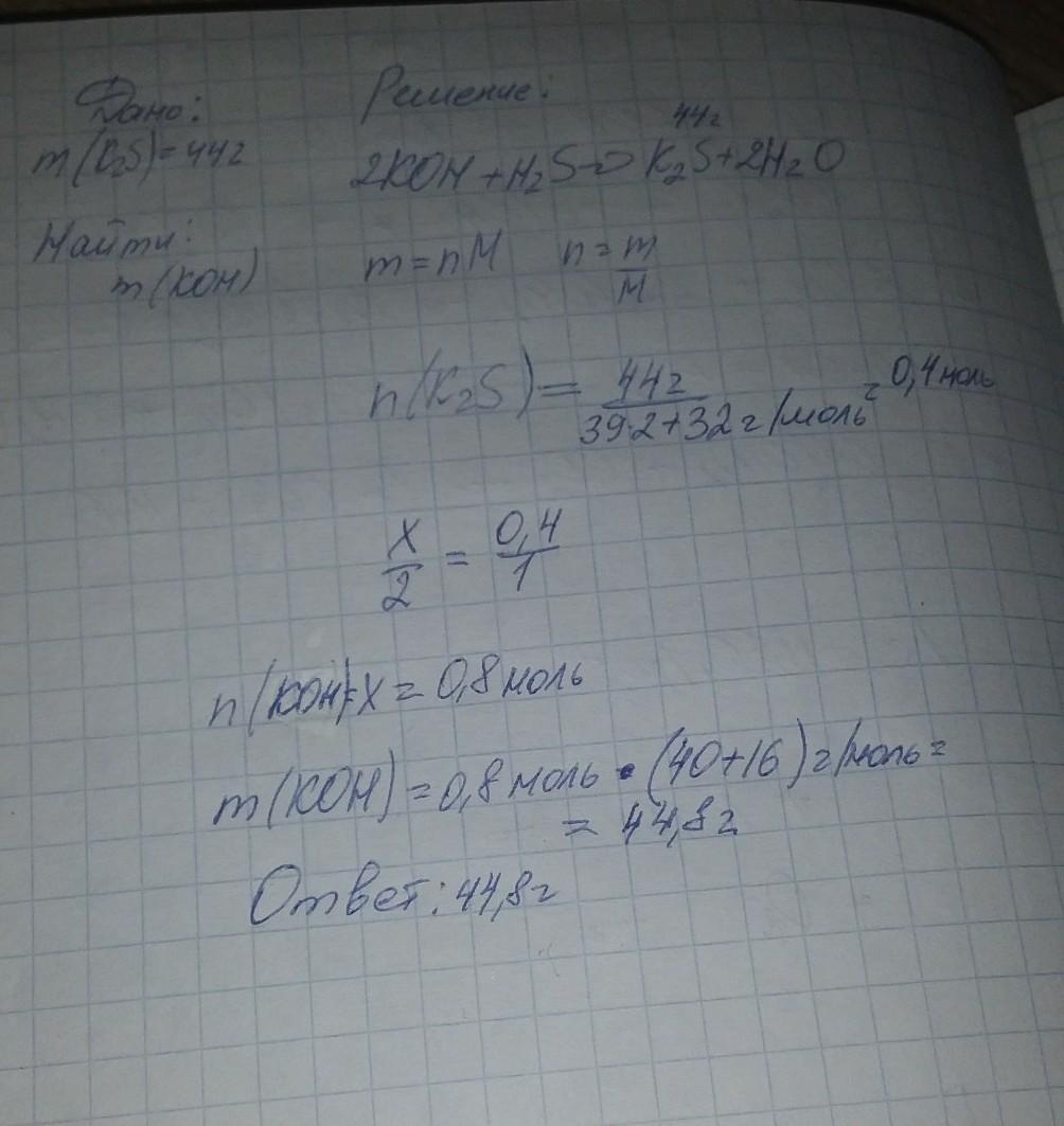 После пропускания через раствор гидроксида калия сероводорода получили 44 г соли. Какая масса гидроксида калия вступила в реакцию?