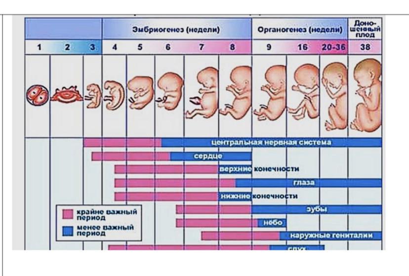 Рассмотри «Схематическую диаграмму периодов развития плода». Обрати внимание на крайне важный период в развитии плода (розовый цвет)