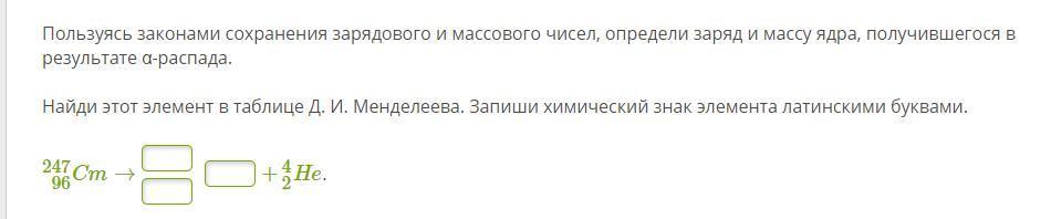 Пользуясь законами сохранения зарядового и массового чисел, определи заряд и массу ядра, получившегося в результате α-распада.