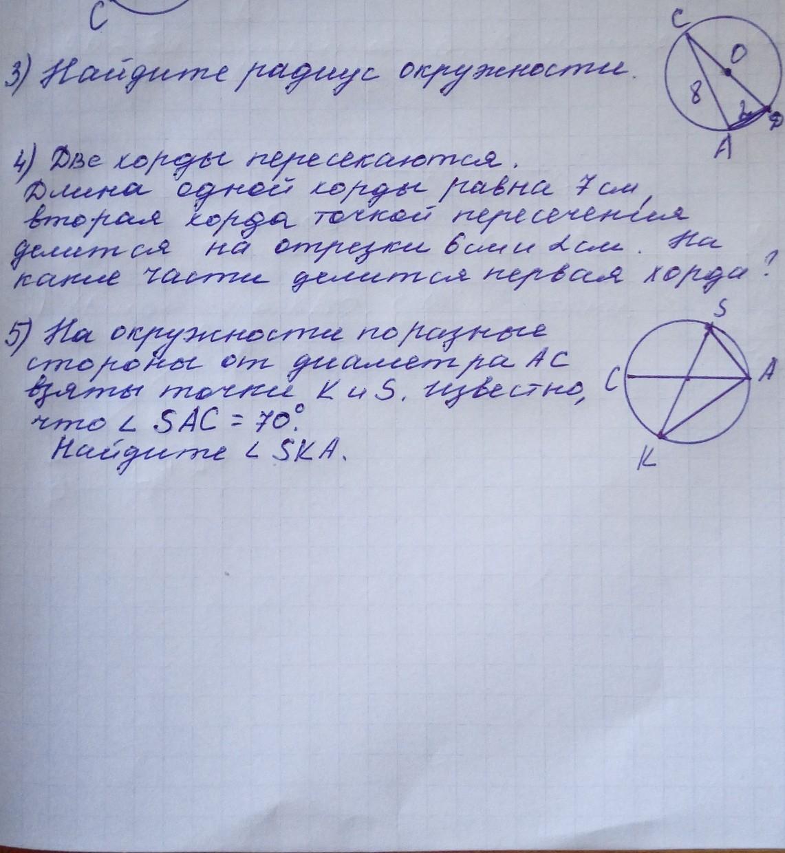 4) хорды делятся одинаково, то есть если первая 2 и 6, то вторая в таком же отношении. 7 - это всего частей. 1 - первая часть, 3 - вторая. Значит первая часть 1.75, а вторая 5.25