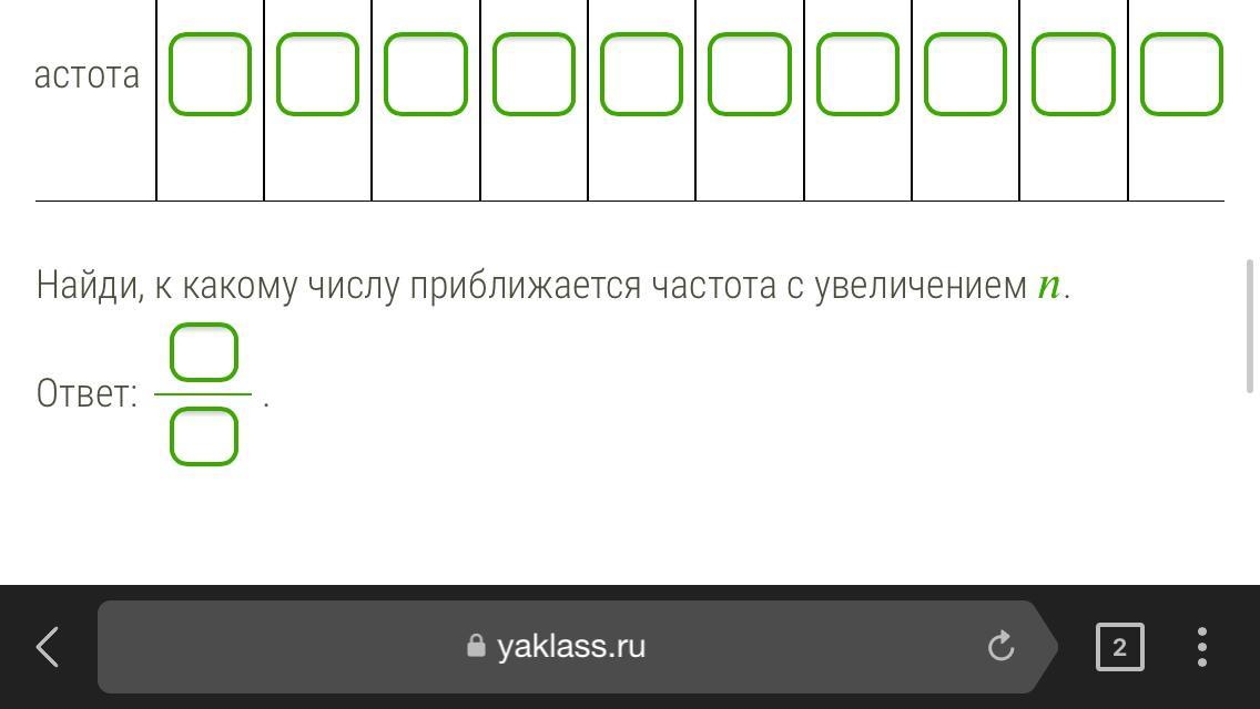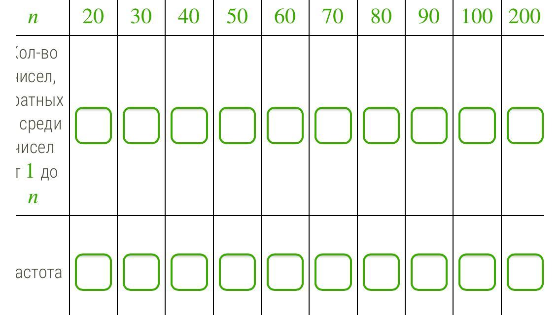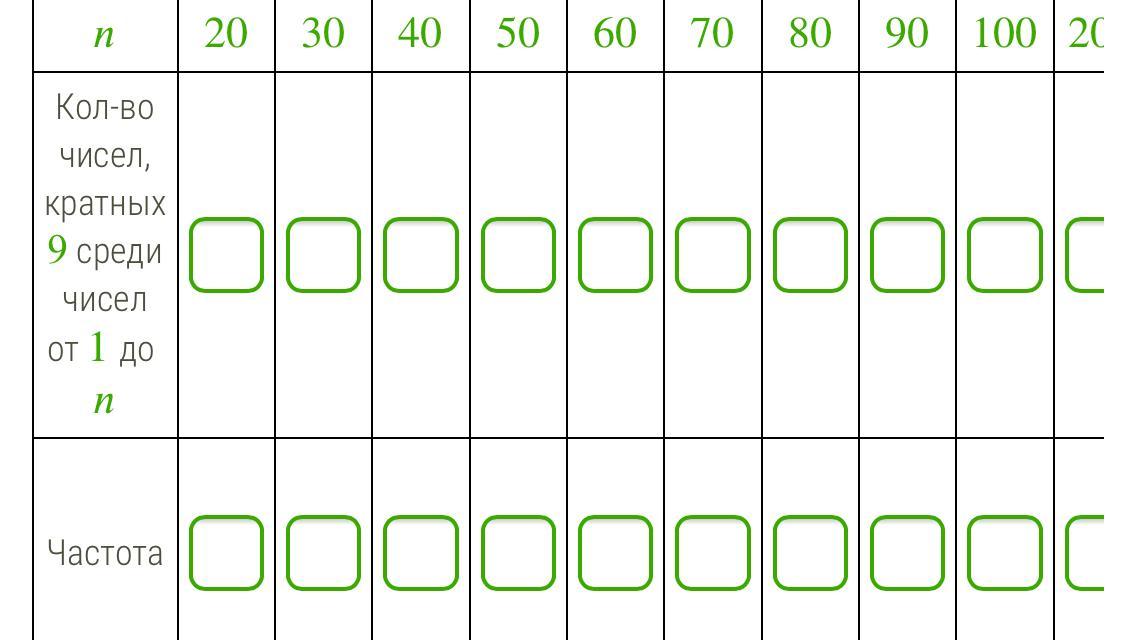 Заполни таблицу появления чисел, кратных 9, среди первых натуральных чисел (частоту пиши как десятичную дробь, округлённую с точностью до сотых):