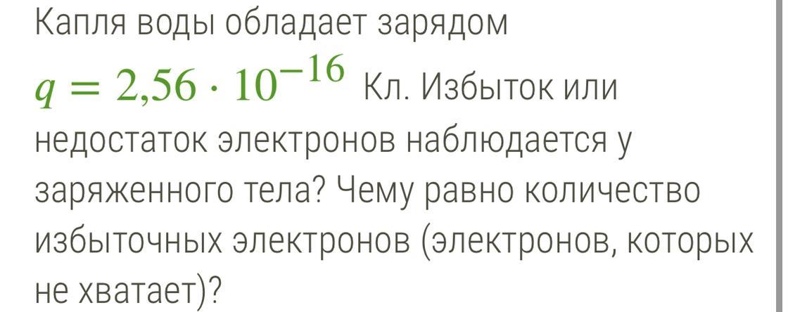 Капля воды обладает зарядом q=2,56⋅10^-16 Кл. Избыток или недостаток электронов наблюдается у заряженного тела? Чему равно количество избыточных электронов (электронов, которых не хватает)?