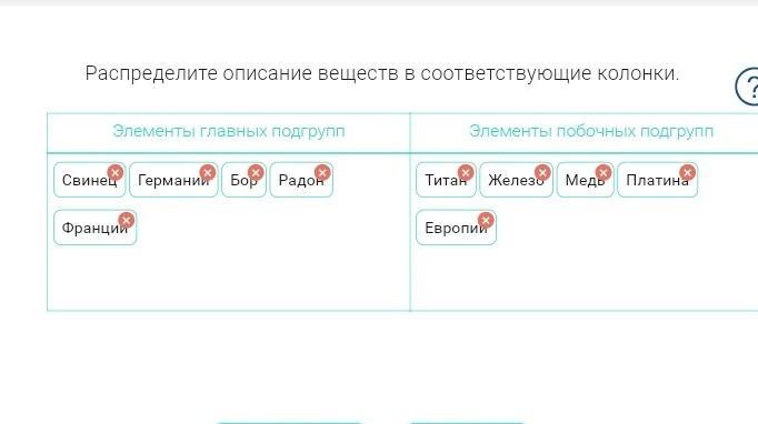 Распределите описание веществ в соответствующие колонки : элементы главных подгрупп, элементы побочных подгрупп: германий, свинец, франций, медь, титан, платина, европий, Бор, железо, радон