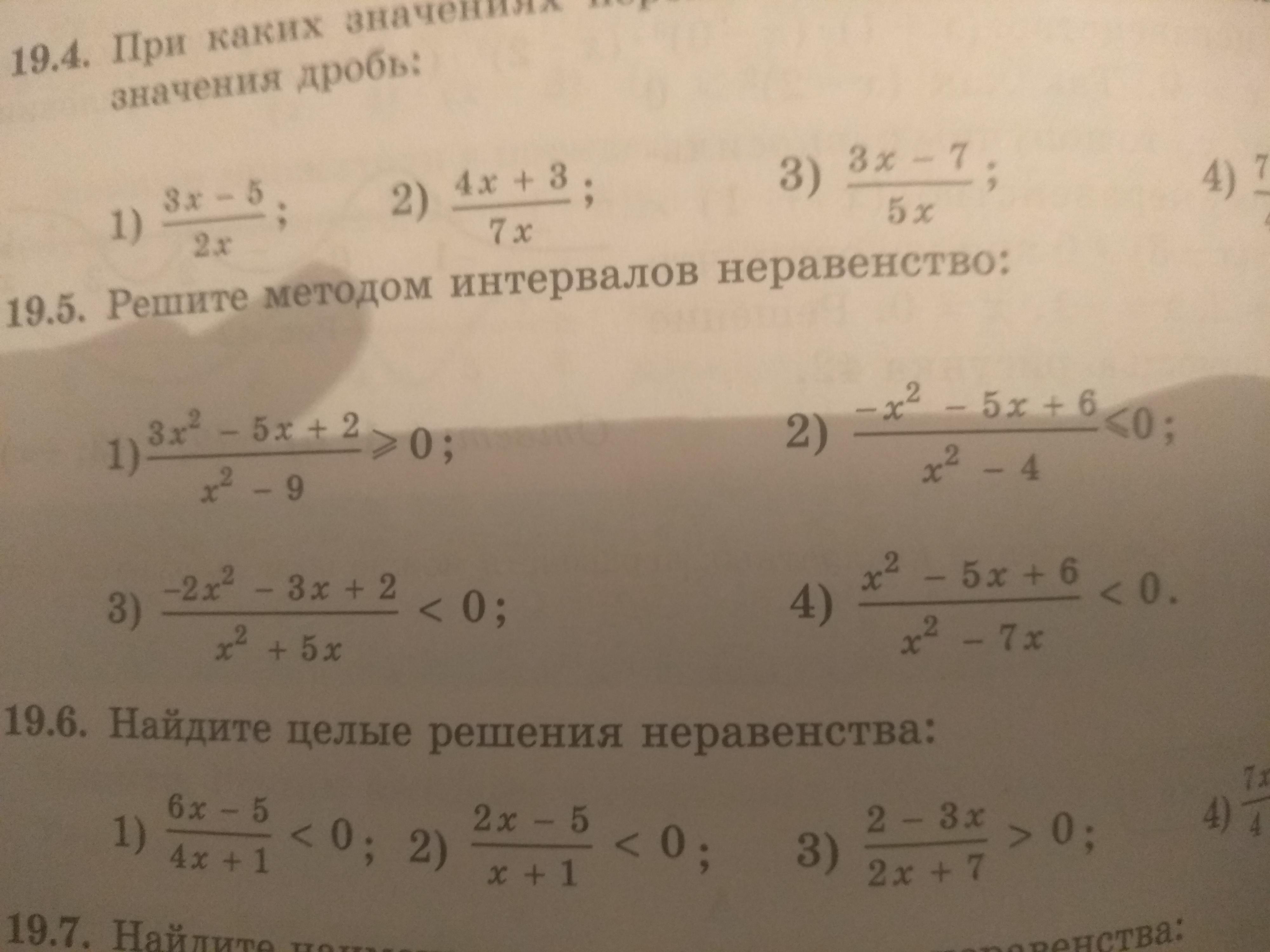 Ответ: Решил первые 2. Остальные делай аналогично. Только только в остальных двух в ответе будут круглые скобки, т.к. неравенство больше(а не больше или равно) нуля или меньше.