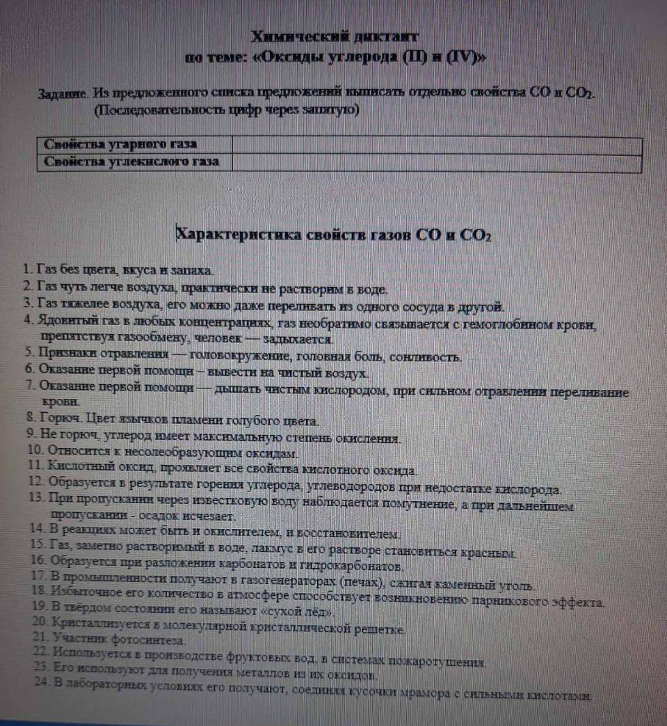Помогите пожалуйста распределить характеристику свойств газов CO и CO2