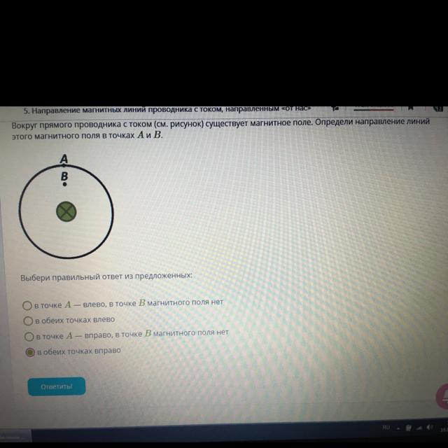 помогите,пожалуйста!вокруг проводника с током существует магнитное поле. определите направление линий этого магнитного поля в точках А и В