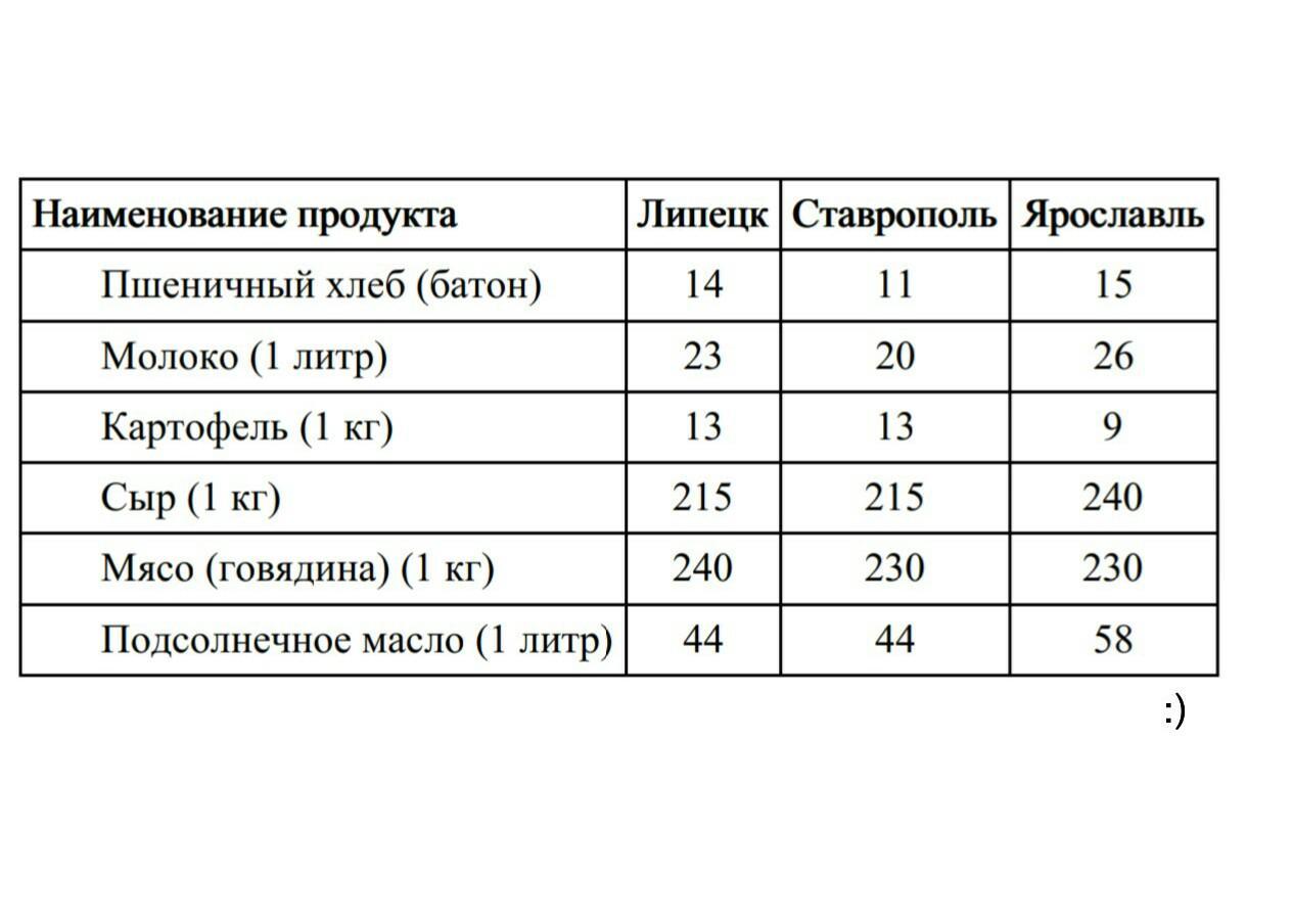 В таблице указаны средние цены (в рублях) на некоторые основные продукты питания в трех городах России по данным на начало 2010 года. Определите, в каком из этих городов окажется самым дешевым следующий набор продуктов: 3 л молока, 2 кг говядины, 1 л подсолнечного масла. В ответ запишите стоимость данного набора продуктов в этом городе (в рублях)