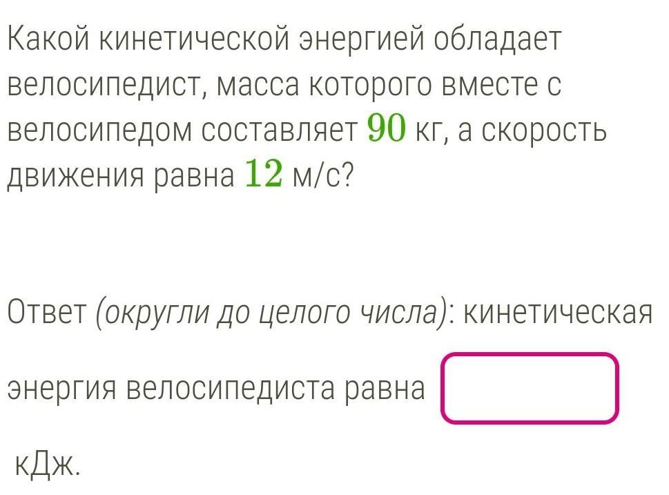 Формула кинетической энергии (m*v^2)÷2 подставляем и получается (90*144)÷2=6480Дж