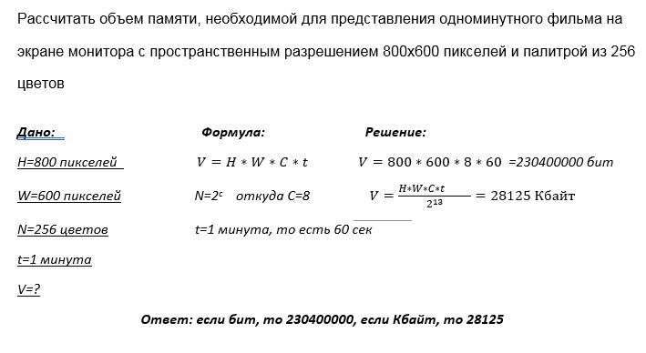 Рассчитать объем памяти, необходимой для представления одноминутного фильма на экране монитора с пространственным разрешением 800х600 пикселей и палитрой из 256 цветов