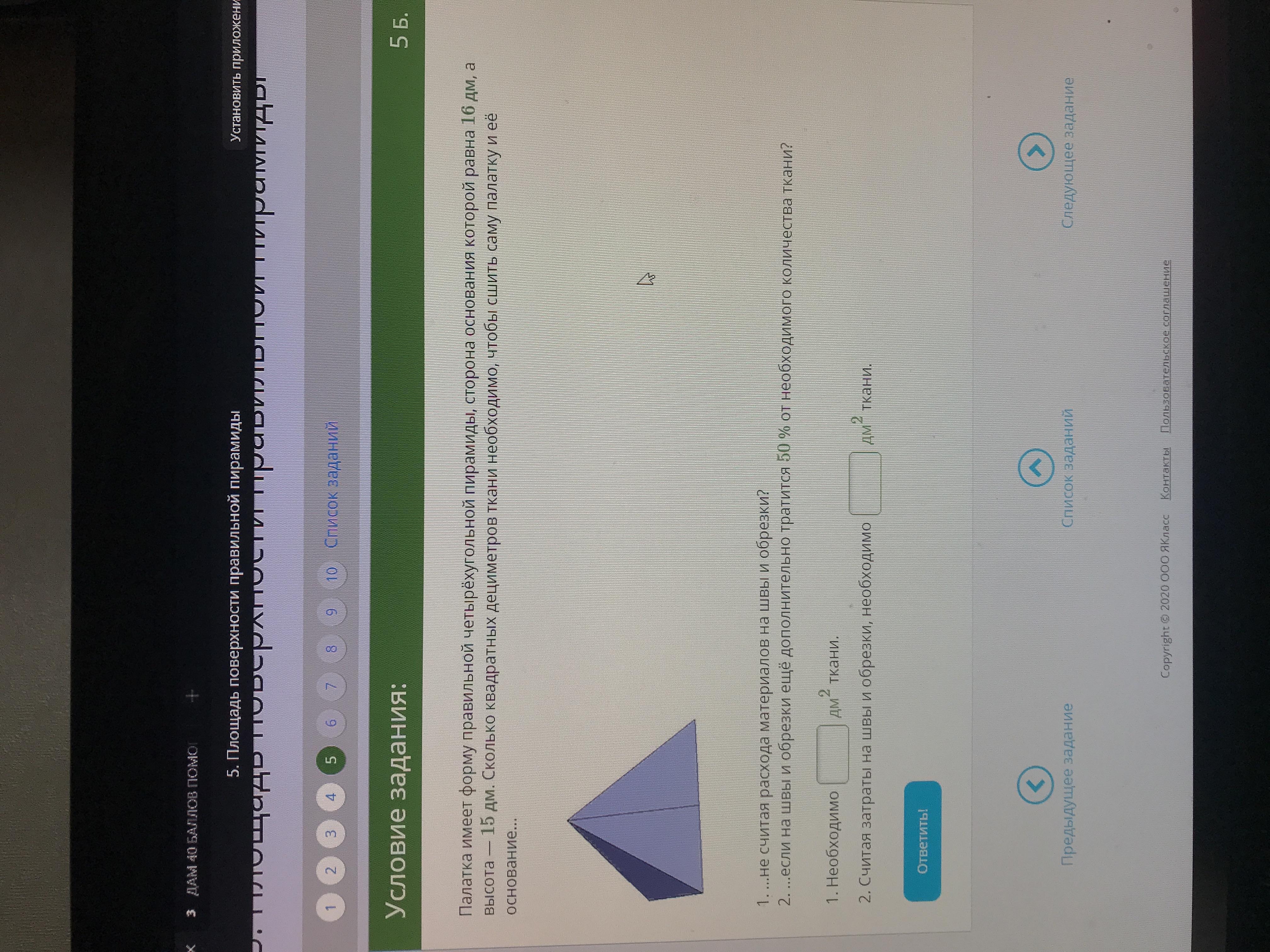Палатка имеет форму правильной четырёхугольной пирамиды , сторона которой равна 16 дм , а высота 15 дм. Сколько квадратных дециметров ткани необходимо, чтобы сшить саму палатку и ее основание.